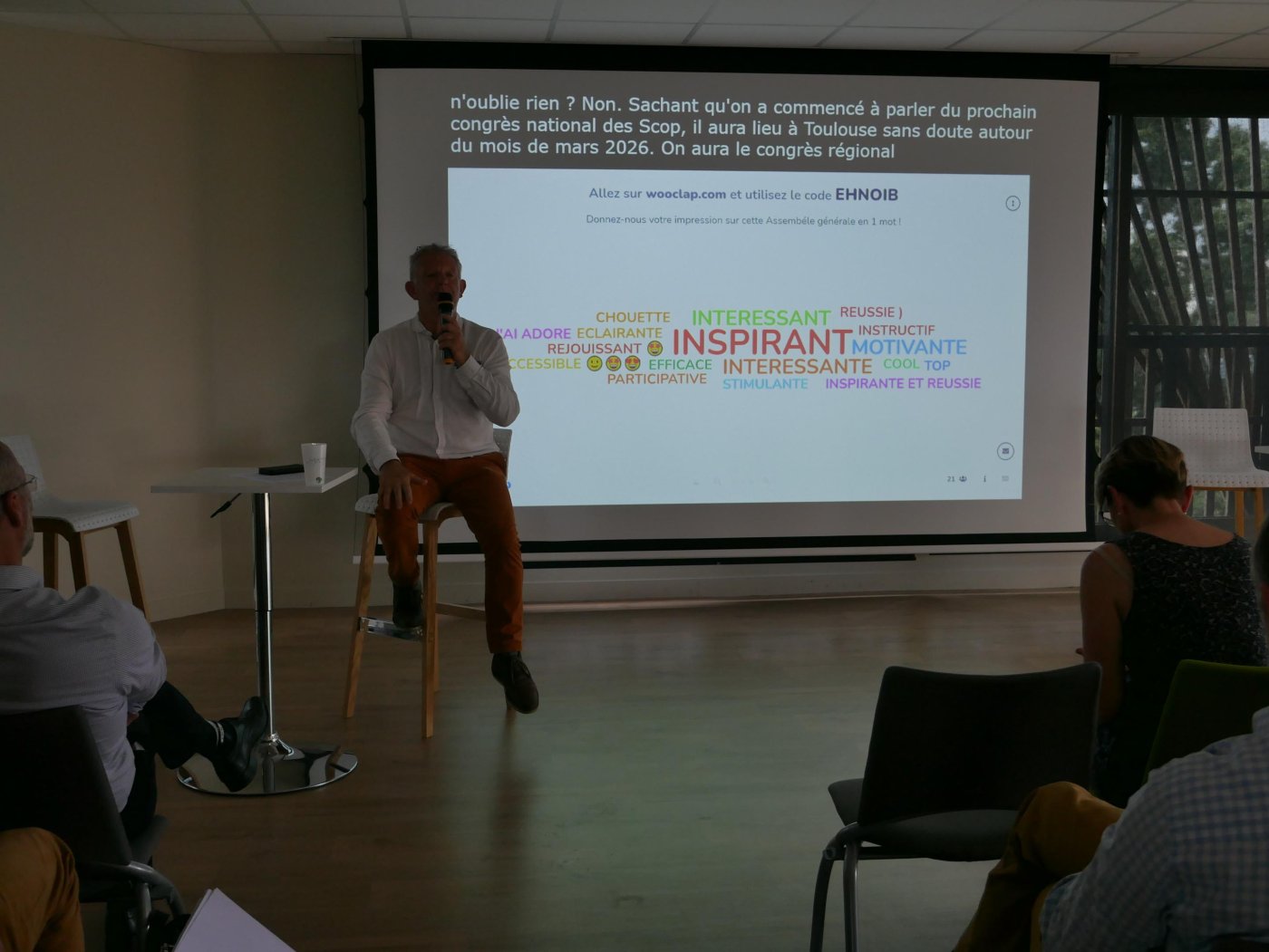 9h15, l’Assemblée générale débute, animée par Sandrine Caroff-Urfer, conférencière et formatrice- consultante chez Perfégal, Scop de notre réseau et ouverte par Serge Boureau, Président de l’UR Scop et Scic Ouest. La cadre est posée d’emblée… pour cette nouvelle assemblée, l’inclusion est une fois de plus de mise avec la retranscription de l’événement en direct, permettant aux personnes malentendantes de suivre les échanges. Une solution mise en place par Le Messageur, elle aussi Scop de notre réseau.