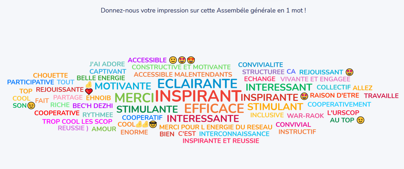 Enfin, un mur de mot interactif a été mis en place pour accueillir leur impression sur l’ensemble de l’assemblée générale. Un mot a été le plus utilisé : inspirant ! De quoi ouvrir les appétits et les sujets de discussion pendant le moment convivial qui a terminé cette journée d’assemblée générale.